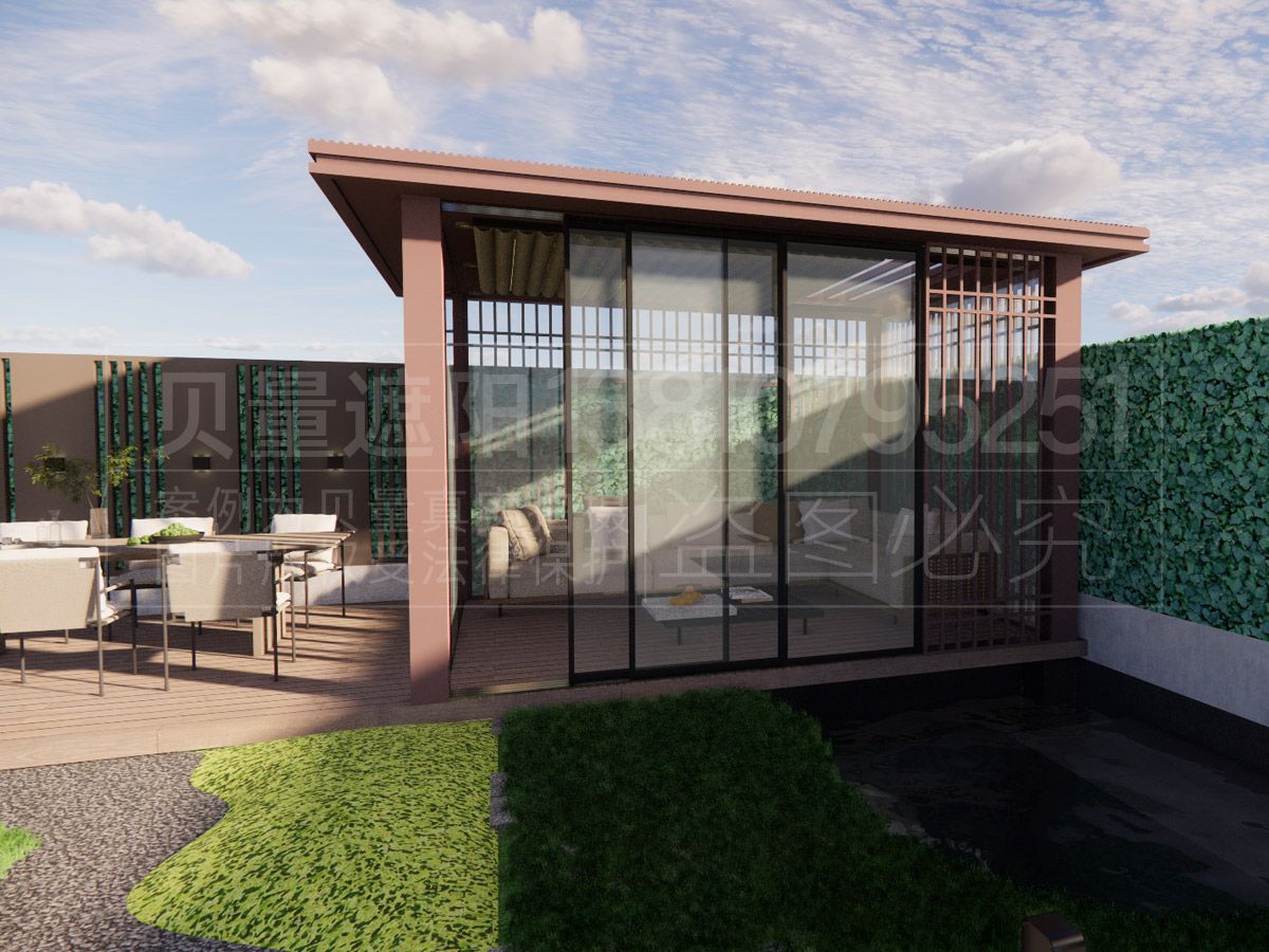 [全方位防护,舒适每一天]配备先进的遮阳、遮雨系统,包括可伸缩遮阳篷和防风卷帘,铝合金凉亭能在任何天气下为您提供舒适的休闲环境。推拉门和折叠门的设计,更使凉亭空间灵活多变,满足不同场合的需求。